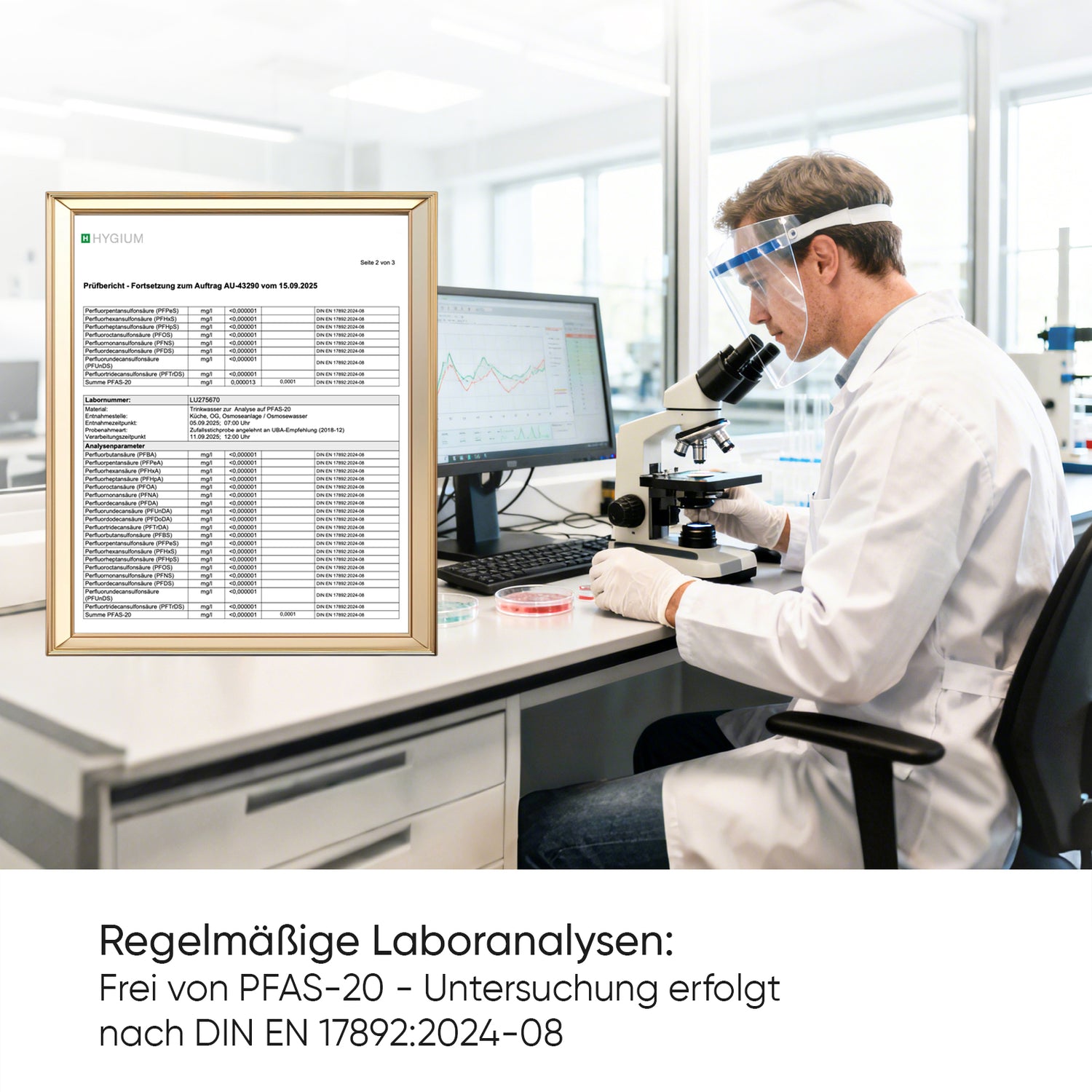 Die Reinheit des gefilterten Wassers wurde durch das unabhängige Prüflabor Hygium GmbH (Köln) getestet – einem nach DIN EN ISO/IEC 17025 akkreditiertes Labor für Trinkwasserhygiene.